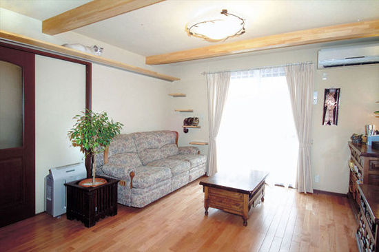 这是从和式房间改造而来洋式房间。本来这里的透光不是很好,所以地板就铺了一种叫西南樱木的无纹样木材,很光亮,墙壁使用了硅藻土。照明有可以调节光暗的设置,想要怎样的气氛也能随意调节。另外,不同的光照,硅藻土也会有不同的模样显示出来,整个屋子也会随之产生变化。