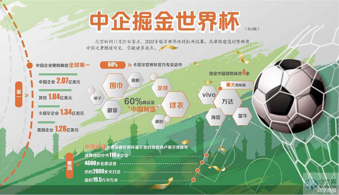 北京时间11月21日0点,2022卡塔尔世界杯揭幕战将展开。四年一届的世界杯作为全球最大的体育盛事,也迎来了一场商业价值最大的体育营销盛会。参与其中的中国企业不仅有万达集团、海信集团、蒙牛、vivo等知名品牌,其周边商品六成来自“义乌制造”。在业内看来,世界杯等国际体育赛事在全球范围内享有广泛的影响力和观众基础,这对于中国企业的全球化拓展有着重要的作用。