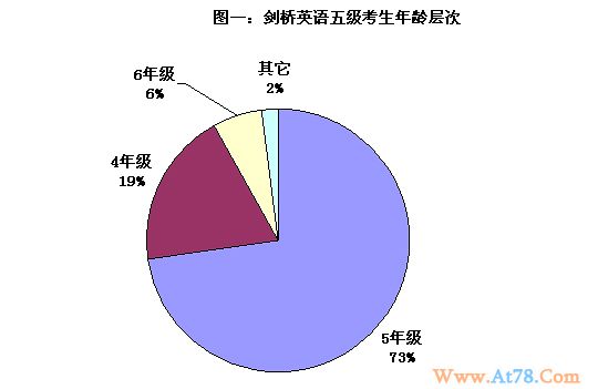 此次调研结果显示,从参加剑桥英语五级考试考生的年龄分布来看,5年级考生占到72%,4年级占19%,6年级占6%,其它年级占2%(见下图)。从这个数字不难看出,参加剑桥英语五级考试的主流人群是5年级的小学生。这个年龄段的学生比6年级的学生有时间、有精力,又比4年级的学生有积累、有能力,提早获得剑桥英语五级证书,是他们在小升初之战中必备的“武器”。从这个意义上说,5年级的小学生最适合参加剑桥英语五级的培训及考试,同时也是目前参加该项考试的主流人群。