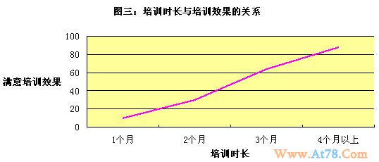 此次调研从对备考剑桥英语五级考试的偏好方式的分析来看,73%的调查参与者表示考生考前参加过有针对性的培训班,这表明考前培训这种形式得到了大多数受访者的认同。然而,总体上认为培训效果较好的仅占12%,这部分群体的培训时长大多为4个月以上。从培训时长和培训效果的关系来看,培训时间越长,对培训所持的满意度越高。培训时长仅为1个月的考生对培训效果表示满意的仅占10%,而培训4个月以上的考生绝大多数都对效果表示满意。(见下图)。