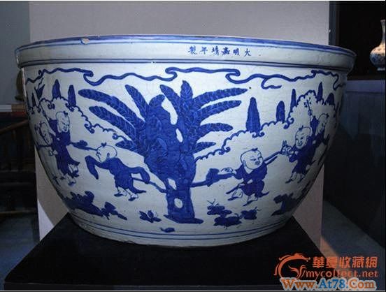 这只嘉靖的婴戏缸,在嘉靖时期明确记载因嘉靖好多年没有男孩,故下旨烧造一批婴戏题材的瓷器进宫。当时烧造这样的大缸难度极大,有一传说就是为烧造此类大缸有窑工跳入炉中之说。这件72公分的婴戏题材的缸至今为止还是发现的唯一相对完整的一只。