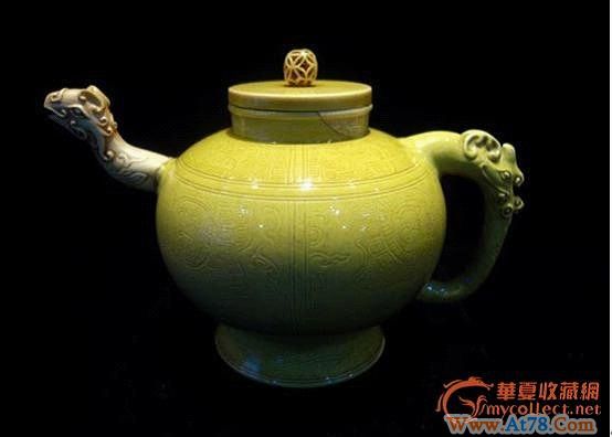 我收藏的这把康熙的黄釉饕餮纹壶,也是至今为止发现唯一的一只带款的,故宫的那只没有款。这只是康熙本年款。壶嘴和盖都是晚清象牙雕刻的,雕刻的相当精细,说明在民国的那个时候收藏界就很重视这类东西了。