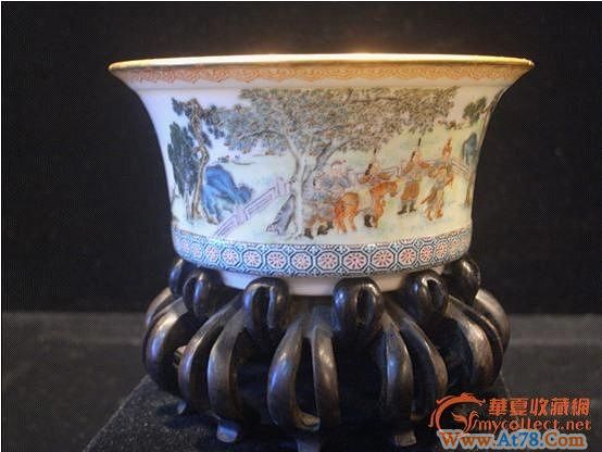 这件旭华堂制赠的杯子在法国的集美博物馆有藏同类一件,虽然是堂名款,但这个杯子记载着乾隆时期平定大小金川奖赏功臣的赏品.这个杯子做工精细,纹饰精美,表现几个将军接受赏赐的情景.虽然这件有伤残.但无论从历史文化的角度\艺术的欣赏角度很有收藏价值.