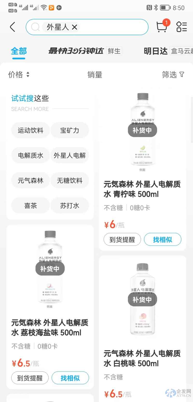 在盒马APP显示,北京朝阳多家店面宝矿力水特、元气森林外星人均显示补货中,部分农夫山泉旗下尖叫电解质饮料也在补货中。