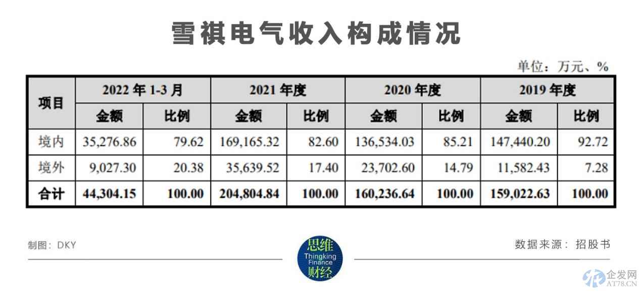实际上,雪祺电气设备也存在着类似的烦恼。尽管,雪祺电气设备为了能给公司找寻新增长点,加强了海外顾客的开发设计。其海外收益2019年为1.16亿人民币,而2022年一季度当季就达到9027.3万余元,海外收益在企业全年收入里的占有率已由2019年的7.28%增至了2022年一季度的20.38%。