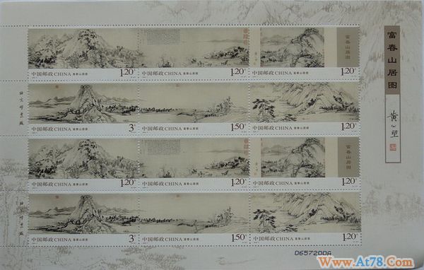 《富春山居图》是元朝画家黄公望的代表作,以浙江富春江为背景,被称为中国十大传世名画之一。全画前段较小,称“剩山图”,现藏浙江省博物馆;后段画幅较长,称“无用师卷”,现藏台北故宫博物院。如此分离,也赋予其特殊含意,因此该画被印上邮票后,一直成为市场热点。