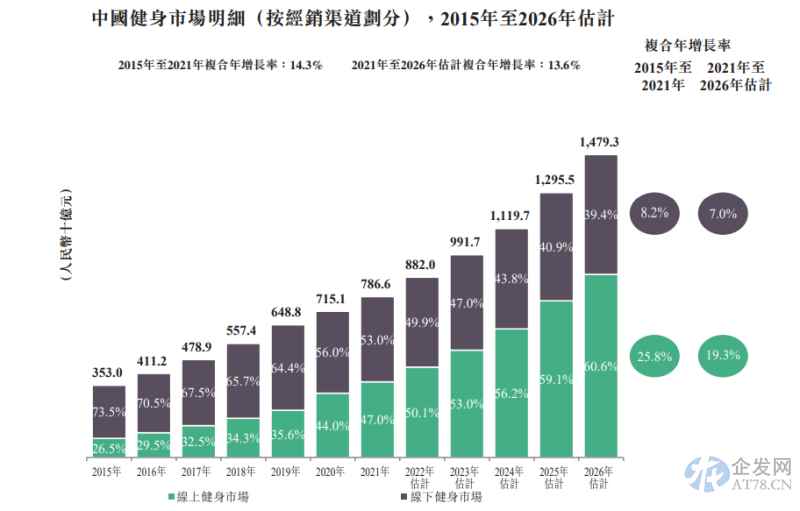 灼识咨询相关报告显示,中国的健身人群渗透率预计于2026年将达到29.3%,中国于2021年为全球健身人群最多的国家,达到3.03亿,预计到2026年将达到4.157亿。2021年中国线上健身市场占整体健身市场的47.0%,预计2026年将占60.6%。