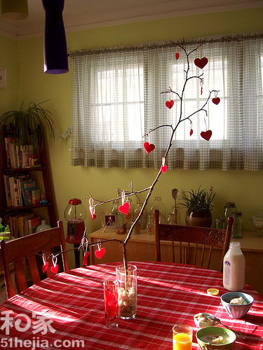 点评:别人都用花朵进行装饰,你却用自制的心形小树装点餐桌,让人觉得新意十足。红色小心飘动,感觉餐桌浪漫有加。红色格子桌布映衬着喜庆,这是婚房餐厅最好的装饰了。