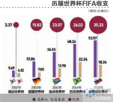 与主办国不同,对于国际足联来说,世界杯是低投入高回报的赚钱良机。据了解,国际足联无需支付场地和基础设施费用,只需承担东道国组委会的费用、比赛奖金、球队备战等杂项费用。今年,国际足联预计将花费17亿美元,其中包括4.4亿美元的奖金和每支球队150万美元的备战费用。