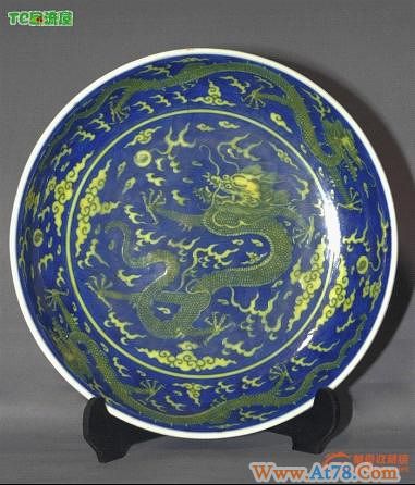 “大清乾隆年制”款 官窑 敞口,浅腹,卧圈足。内外壁各饰两条游龙戏珠,器物成型。全器以青花为地黄彩装饰,胎釉精良更衬托出黄彩的鲜艳。 此器的纹样、构图与乾隆其它品种的龙纹相同,不同之处在于它没有以黄釉为地,只是将黄釉作为色彩,用来绘画龙、云等纹样。青花黄彩器需二次烧成,即先烧成蓝地白花,而后由白釉处填黄彩,故工艺复杂,装饰华丽。据《国朝宫史》卷十七中规定,这种蓝地黄彩器物,一般由皇宫内的“嫔”使用。