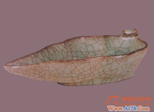 洗口为叶片形状,侈口外撇,平底圈足。胎体较厚,全体均施天青色釉,色泽较深,口沿处带咖啡色。器见外开叶脉状不规则碎纹片,洗内底纹片较大。造型别致可爱,整体清雅非常。