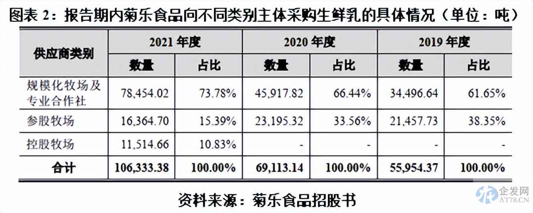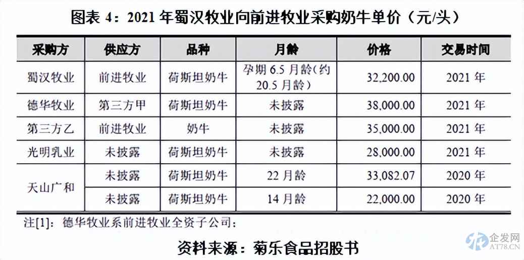 2020年,前进牧业设立甘肃蜀汉牧业有限公司(以下简称“蜀汉牧业”),主要业务为奶牛养殖和鲜奶生产销售。为获得自有牧场及奶源,2021年2月,菊乐食品出资8250万元收购蜀汉牧业55%的股权,招股书中,菊乐食品将与前进牧业的交易按照关联交易披露。