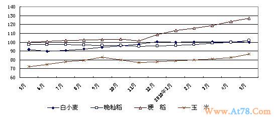 粮食收购价格小幅上升。5月份,全国25个粮食主产省(区、市)国有、非国有粮食企业(下同)稻谷、小麦、玉米三种粮食加权平均收购价格为每50公斤(下同)99.60元,比上月上涨1.94%,比上年同期上涨11.44%。其中,主产区红小麦、白小麦、混合麦三种小麦平均收购价为97.95元,比上月微升0.07%,比上年同期上涨7.38%。主产区稻谷平均收购价为108.29元,比上月上涨1.68%,比上年同期上涨10.31%。主产区玉米平均收购价格为86.37元,比上月上涨4.75%,涨幅比上月扩大约2.5个百分点。