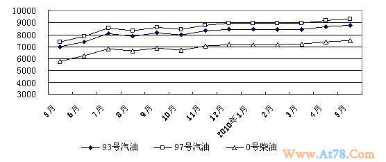 成品油零售价格小幅上涨。5月份,大中城市90号、93号、97号汽油和0号柴油实际零售价格每吨分别为8265元、8790元、9315元、7503元,与4月份相比,分别上涨1.33%、1.25%、1.32%、1.29%。