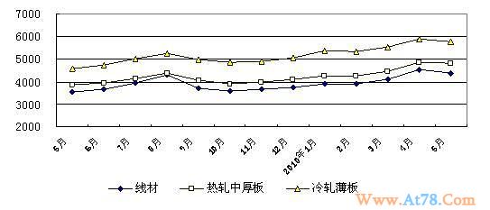钢材价格小幅下降。据对全国30个省(区、市)主要钢材市场监测,5月份国内主要钢材品种价格小幅下降,其中,线材(普线6.5,Q235)、热轧中厚板(6,Q235)、冷轧薄板(1,Q235)全国平均价分别为4391元/吨、4832元/吨、5753元/吨,与上月相比分别下降3.22%、0.90%、2.41%。
