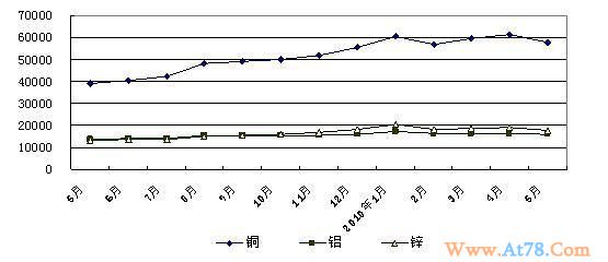 有色金属价格小幅回落。据对大中城市有色金属现货市场监测,5月份六种有色金属价格综合指数由升转降,比上月下降3.77%。电解铜、铝、铅、锌、镍平均价格分别为每吨57565元、15827元、16058元、17573元、175800元,比4月份分别下降6.26%、4.49%、2.64%、7.47%、0.45%。电解锡价格为每吨140872元,比上月略涨1.05%。