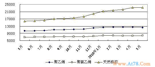 主要化工产品价格稳中略降。5月份大中城市化工产品价格基本稳定。其中,高压聚乙烯、天然橡胶平均价格为每吨12318元、23221元,与上月相比分别下降1.20%、0.53%;聚氯乙烯平均价格为每吨7738元,与上月基本持平。