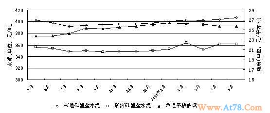 建材价格总体基本稳定。5月份,36个大中城市普通硅酸盐水泥(42.5强度)、矿渣硅酸盐水泥(42.5强度)、普通平板玻璃平均价格分别为407元/吨、362元/吨、25.8元/平方米,与上月相比基本持平。