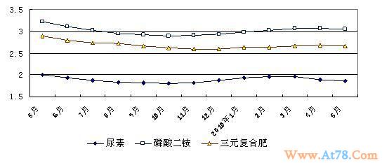 化肥价格继续回落。5月份,国产尿素、磷酸二铵、三元复合肥平均零售价格分别为每公斤1.86元、3.05元、2.66元,与上月相比分别下降1.59%、0.65%、0.75%。