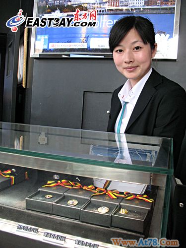 世博期间已有3至5万元、最高8万元/日的销售业绩,游客可在此选购30分至1克拉不等的裸钻,并享受来自比利时皇室御用珠宝商――Wolfers匠人的服务。Angela表示,该公司只为世博特别定制了9款限量版饰品,用放大镜可以看到钻石腰棱上有“2010 Expo Shanghai”的字样,极具观赏收藏价值。